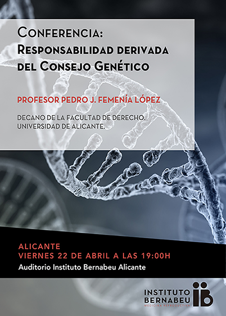 La Fundación Rafael Bernabeu, Obra Social del Instituto Bernabeu, organiza el próximo viernes 22 de abril a las 19:00 la conferencia “Responsabilidad derivada del Consejo Genético”, a cargo del profesor Pedro J. Femenía López, Decano de la Facultad de Derecho de la Universidad de Alicante.