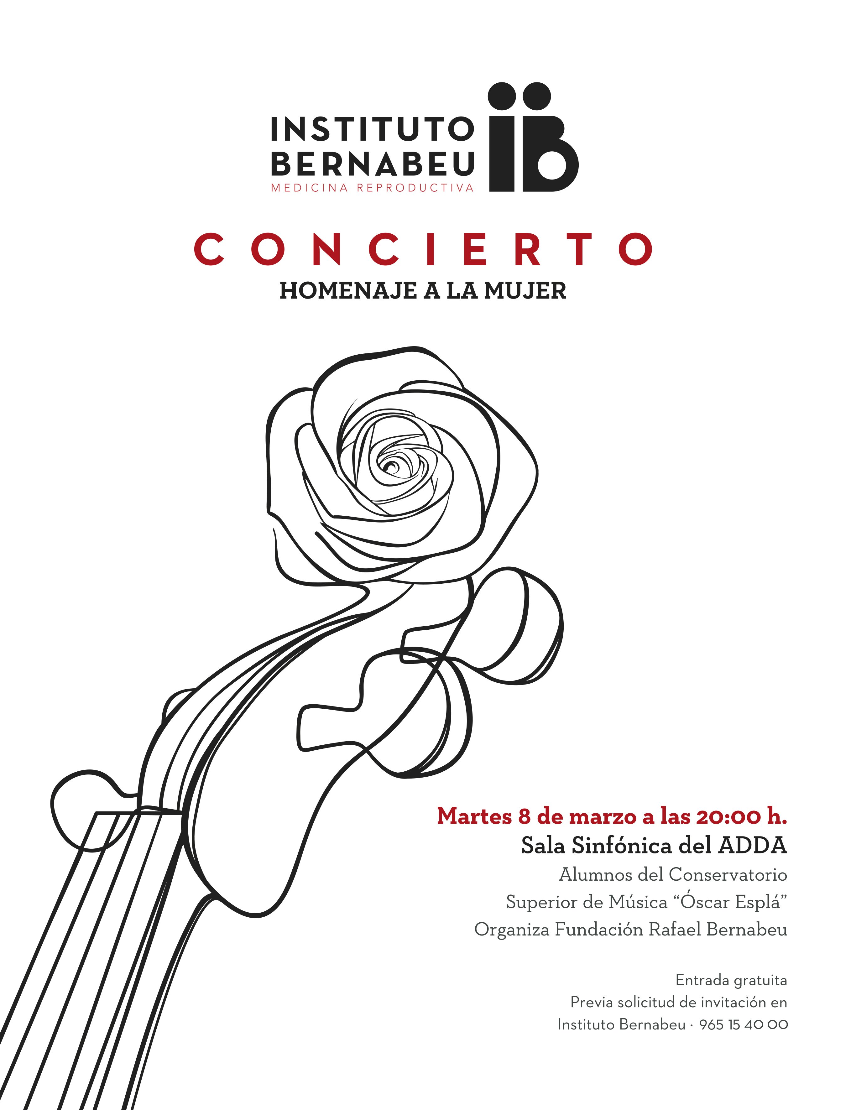 La Fundación Rafael Bernabeu, obra social del Instituto Bernabeu, organiza un año más un concierto para conmemorar el Día Internacional de la Mujer. El evento tendrá lugar el próximo martes 8 de marzo a las 20:00 horas en la Sala Sinfónica del Auditorio Provincial de Alicante (ADDA).